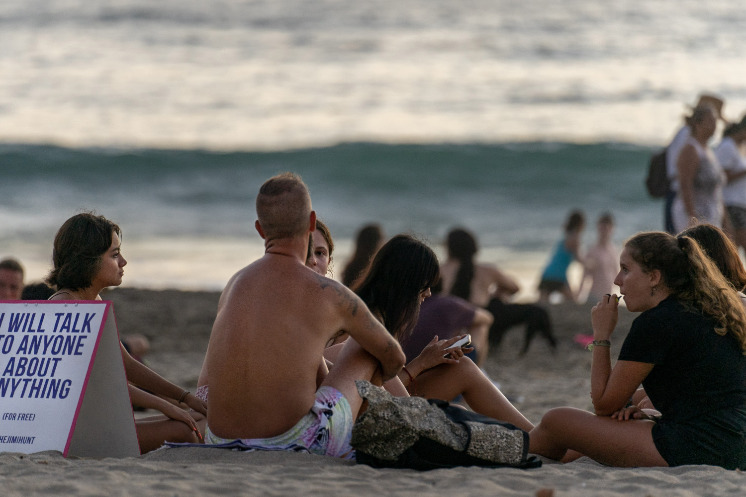 Over the years you may have seen me post pictures on social media of me with a sign that says ‘I will talk to anyone about anything.’ I have had a version of this sign for over seven years, but it is only recently that I have taken it out regularly. Four nights a week I sit for two and a half hours before sunset and talk to strangers on the beach. They are from all over the world, they speak dozens of languages and all have unique and complex upbringings and world views. Yet, so often they have the same questions about life, philosophy, love, satisfaction and mental wellbeing. There is no better classroom for me. They feel like I am helping them, I feel like they are helping me. It’s the ultimate win-win.